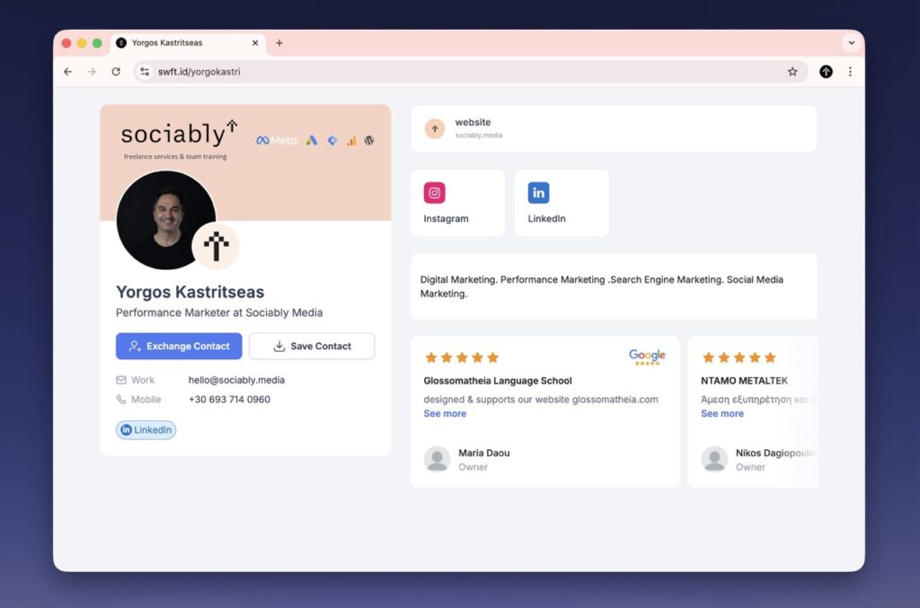 Το SWFT Connect είναι μια σύγχρονη πλατφόρμα ψηφιακών επαγγελματικών καρτών (Digital Business Cards) που σας επιτρέπει: