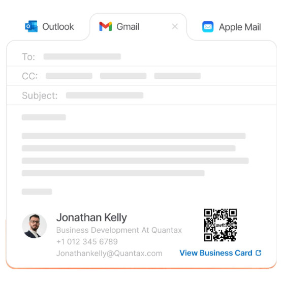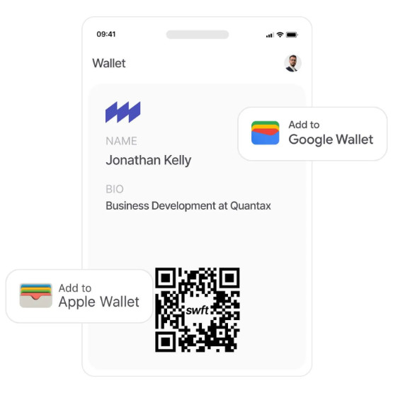 Με το SWFT Connect, μοιράζεστε τα στοιχεία σας άμεσα, προσθέτετε links, υλικό πωλήσεων, social προφίλ και αφήνετε τον συνομιλητή σας να σας αποθηκεύσει με ένα μόνο tap – χωρίς εφαρμογές, χωρίς κάρτες, χωρίς τυπώματα.Συμμόρφωση & Μείωση Ρίσκου.